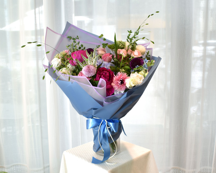 블루색 포장지와 리본으로 마무리하여 시원하면서도 세련된 느낌을 완성하였습니다