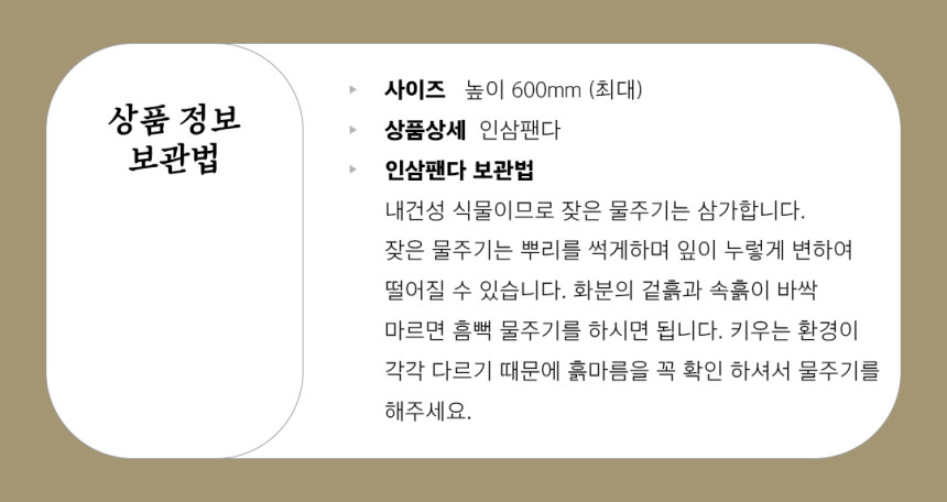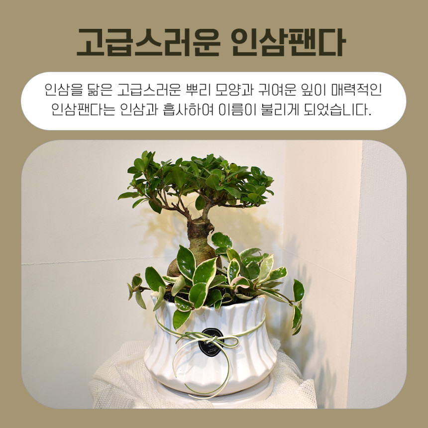 인삼팬다는 공기정화 능력이 탁월하며 매력적인 생김새로 관상용으로도 뛰어나
