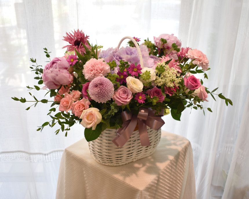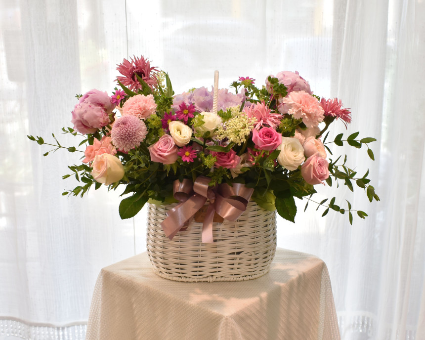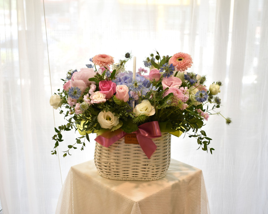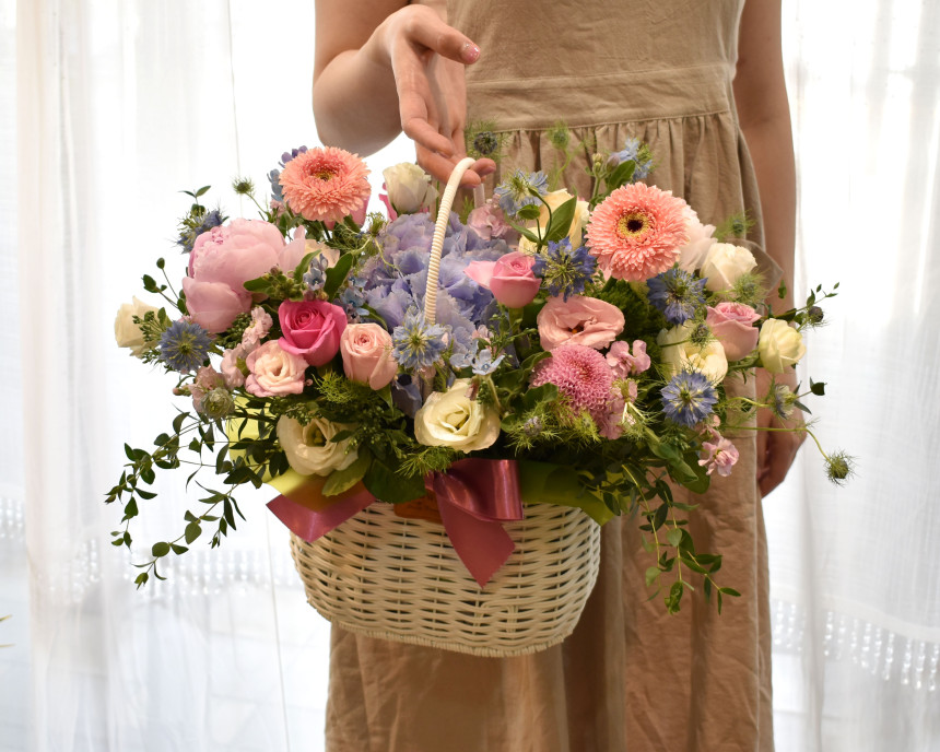 고급스러워 보이는 다양한 꽃들로 매치되어있는 꽃바구니 입니다