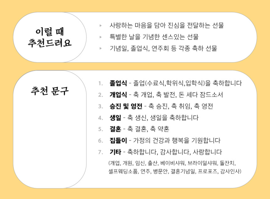"졸업식, 수료식, 학위식, 입학식, 승진, 기념일, 개업, 집들이선물, 임신, 출산, 브라이덜샤워, 베이비샤워, 화이트데이,발렌타인데이 취업선물 등 각종 기념일, 축하선물"