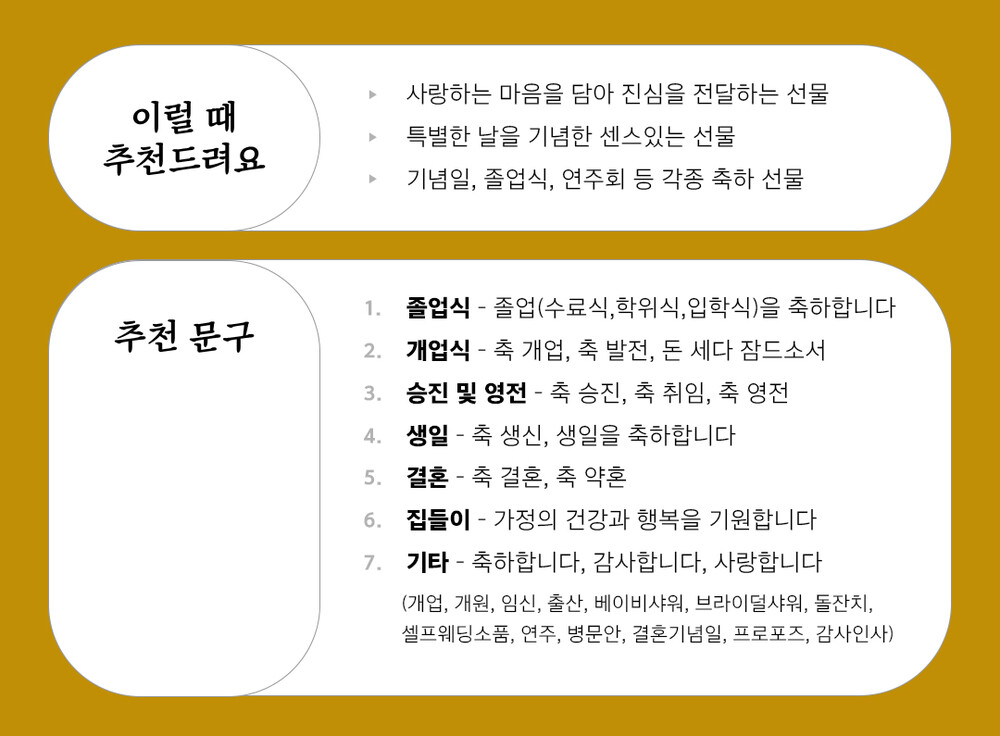 "졸업식, 수료식, 학위식, 입학식, 승진, 기념일, 개업, 집들이선물, 임신, 출산, 브라이덜샤워, 베이비샤워, 화이트데이,발렌타인데이 취업선물 등 각종 기념일, 축하선물"