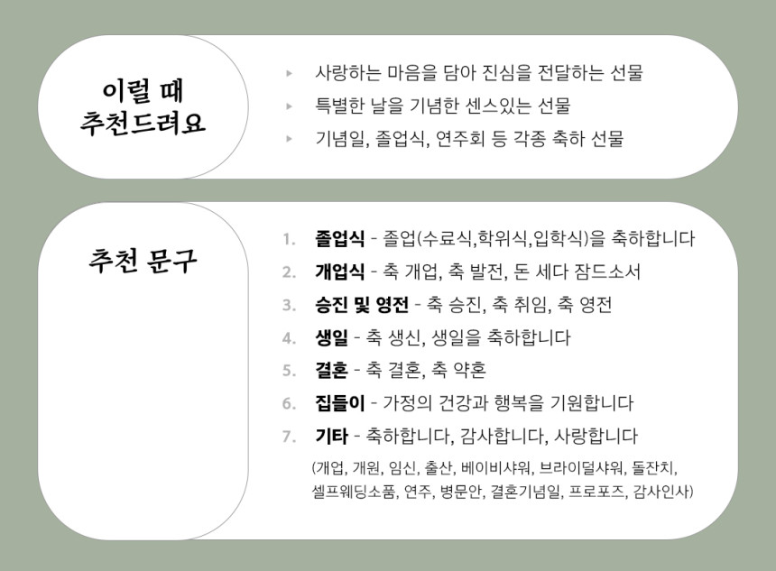 "졸업식, 수료식, 학위식, 입학식, 승진, 기념일, 개업, 집들이선물,