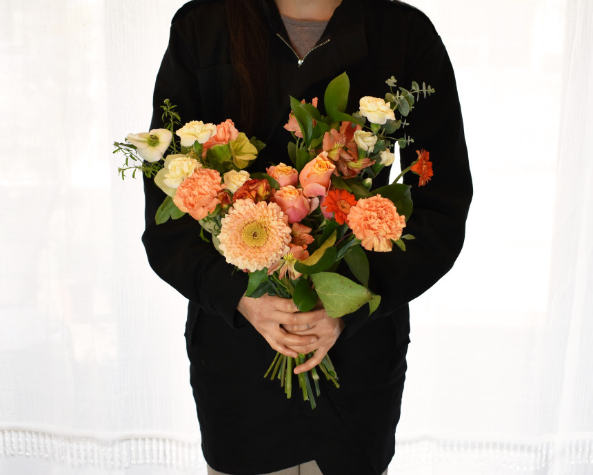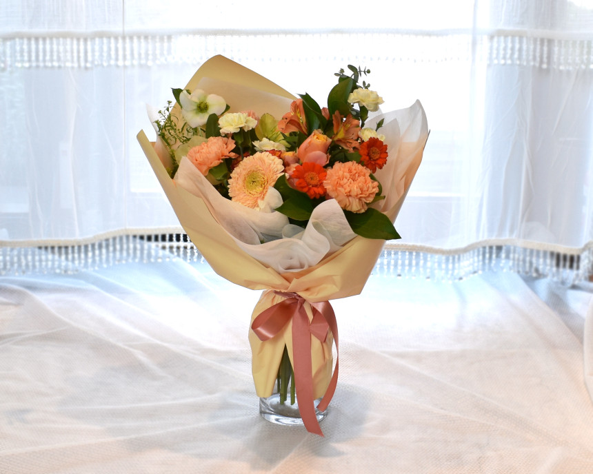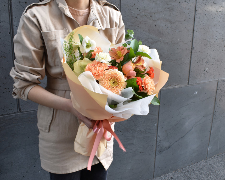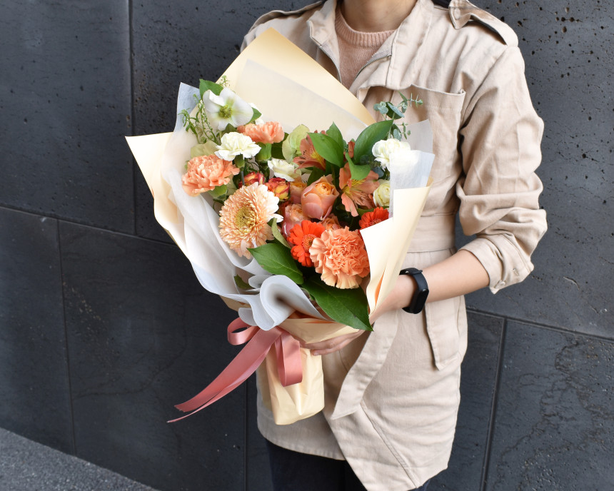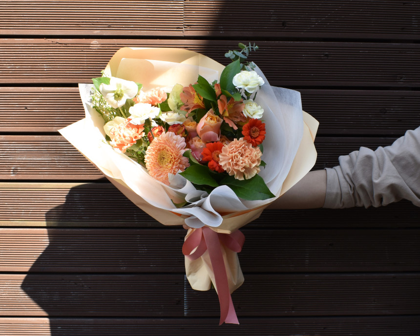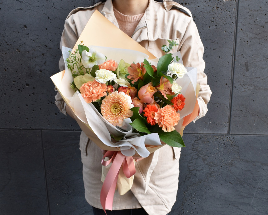 오렌지 카네이션과 전체적으로 오렌지 색감의 꽃들로 믹스한 고급스러운 컬러감의 카네이션 꽃다발 소개할게요