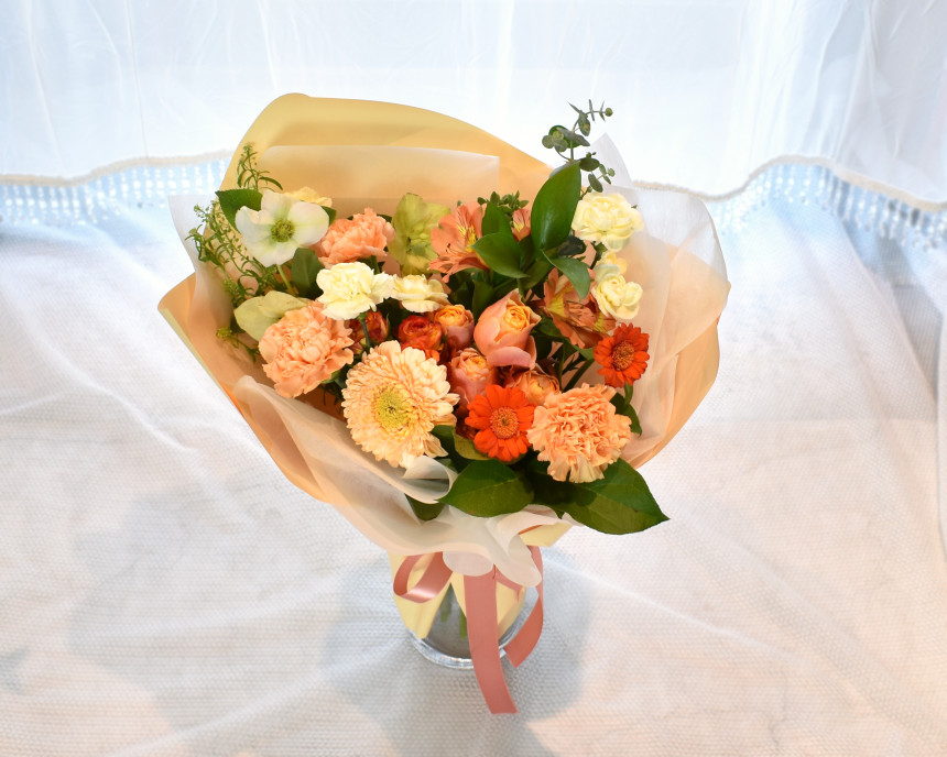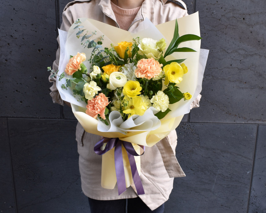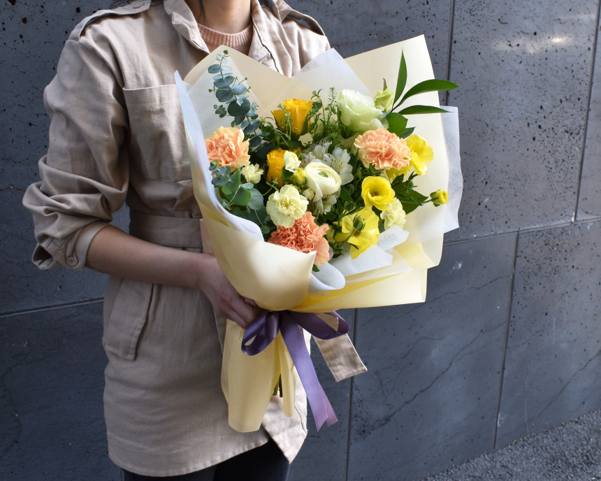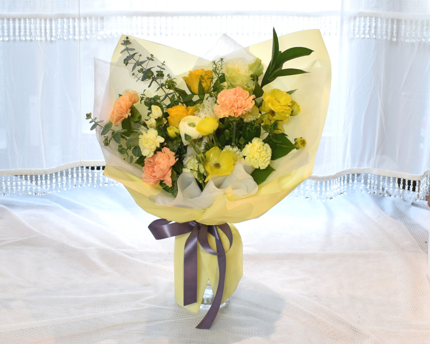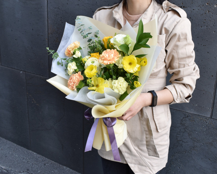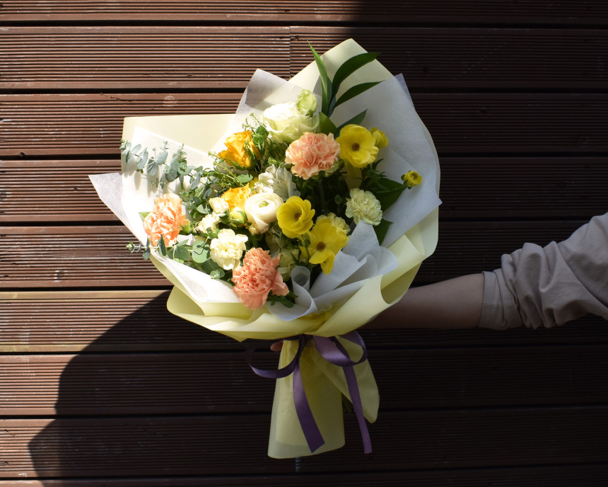 전체적으로 밝고 귀여운 노란색감의 꽃다발입니다