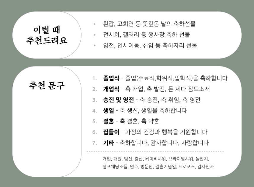 승진,영전,취임,개업,이전,사무실오픈,집들이,생일,전시회,연주회 등