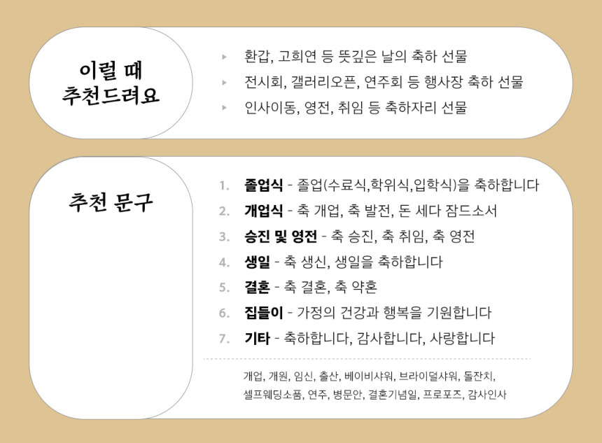 승진,영전, 취임, 개업, 전시회, 연주회 등 격식있는 자리, 특별한 행사에 품격과 센스를 담은 선물을 전해보세요.