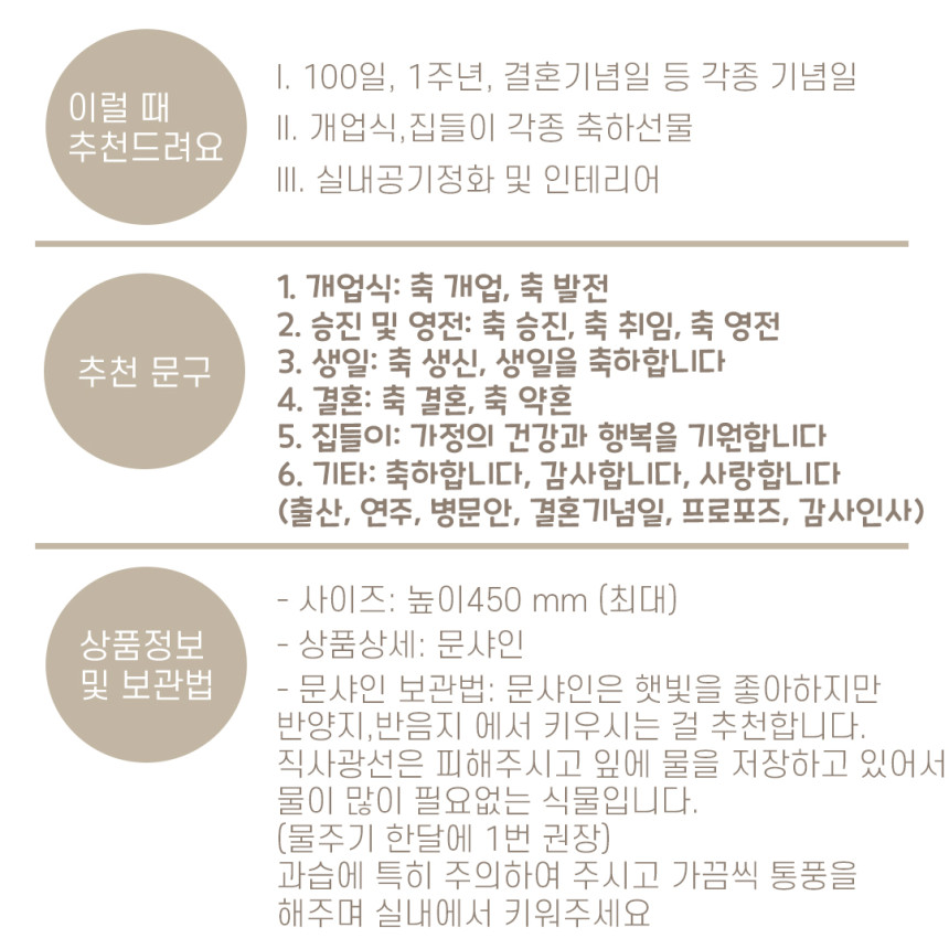 상품전체의 정확한 높이 사이즈는 자연적인 식물의 특성상 화기에 심겼을 때 달라질 수 있습니다