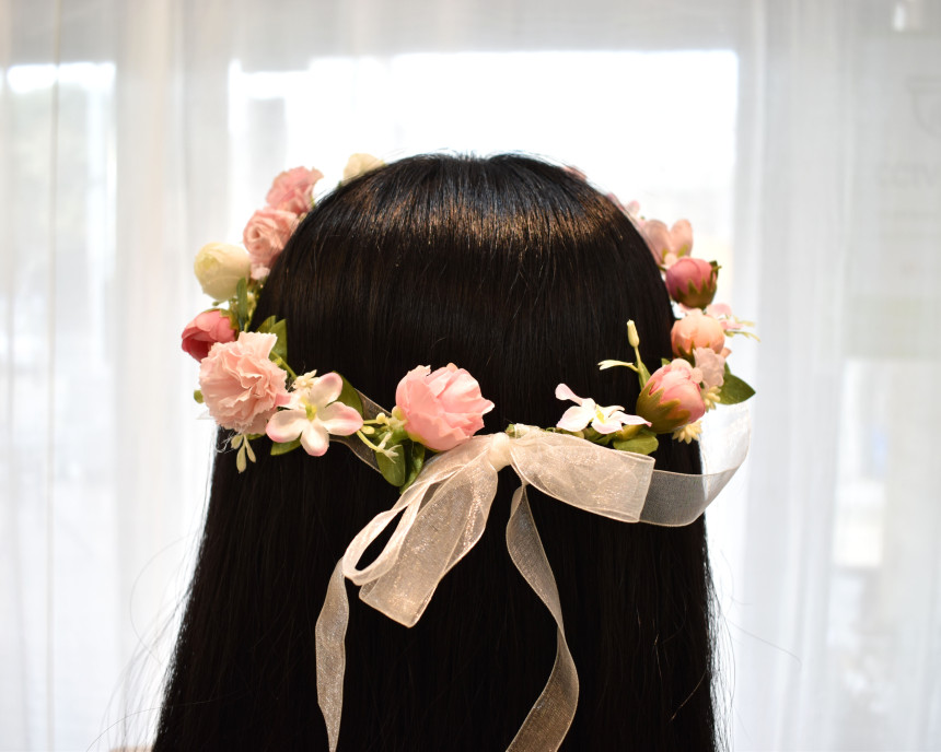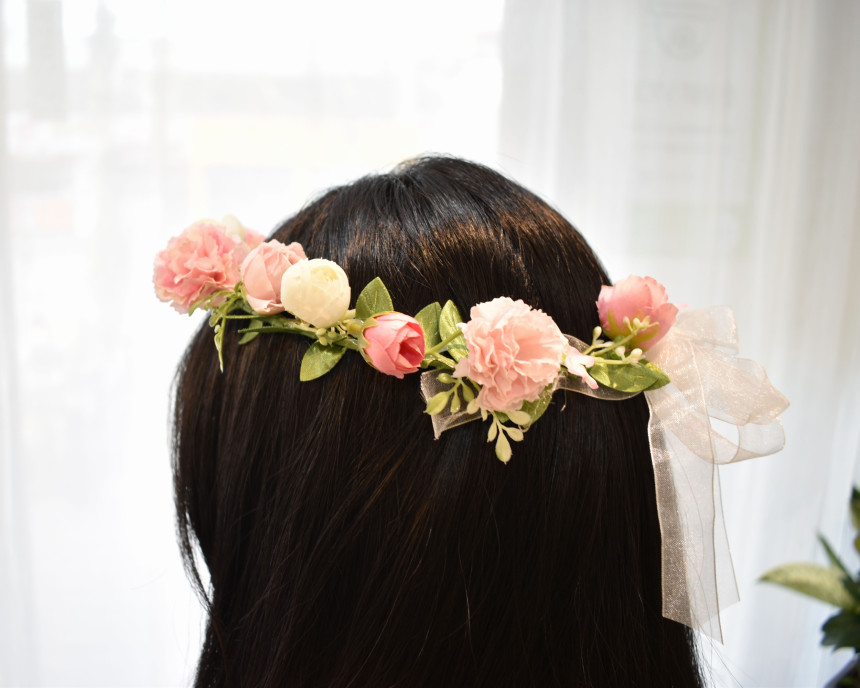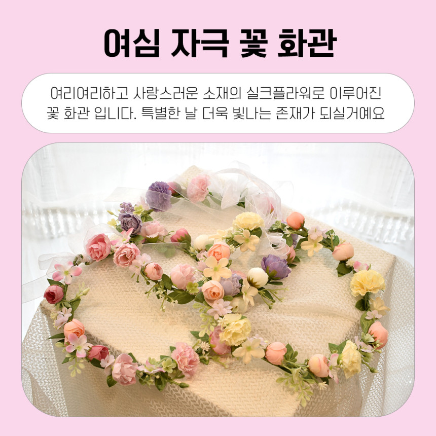 사랑스러운 분위기를 연출 하실 수 있는 핑크 꽃 화관 입니다